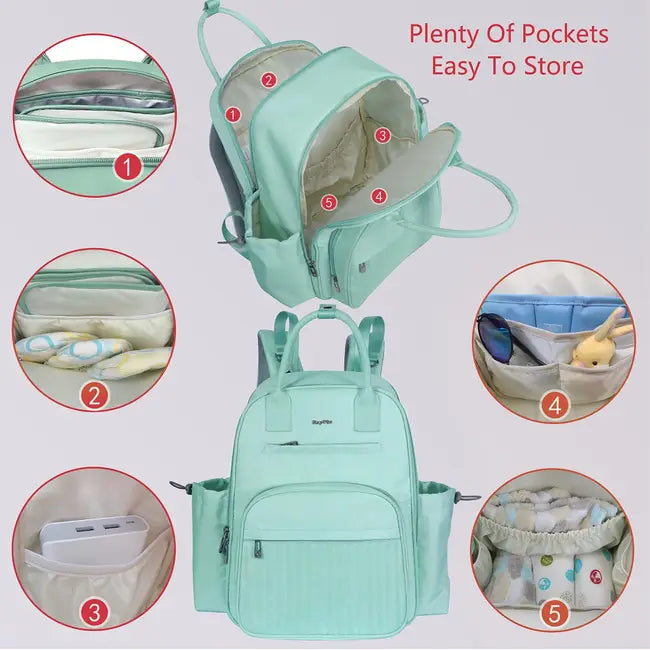 This diaper backpack feathers 3 functional big storage compartments and 19 pockets, 4 exterior pockets for storage of water bottle, wipes, sunglasses, lipstick or anything for easy-access.